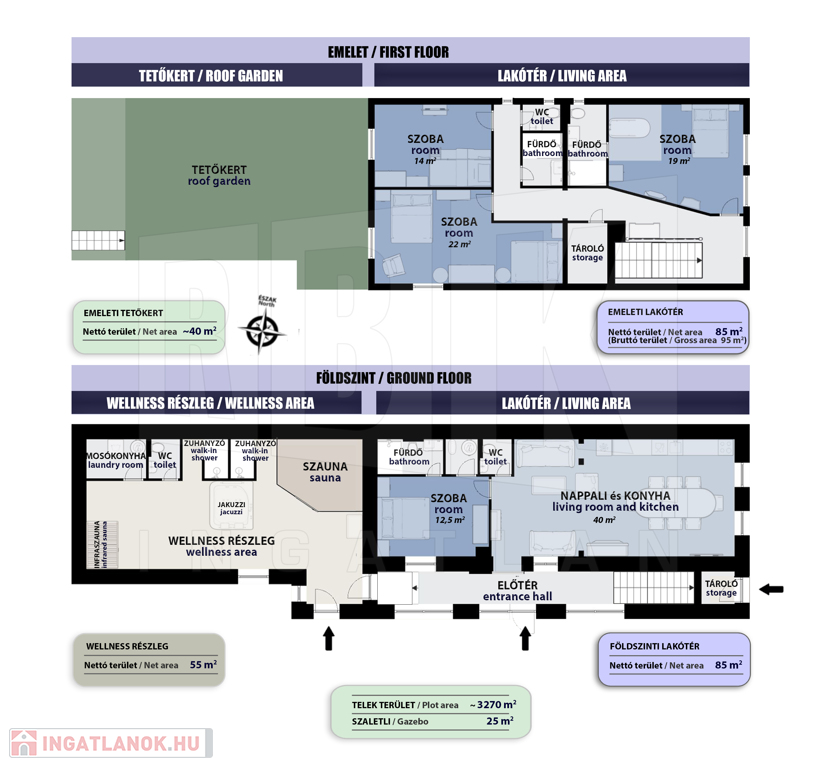 ---- Az emeleti lakótér mellett helyezkedik el a wellness helyiség tetején kialakított TETŐKERT, amely a kertből közelíthető meg. Igény esetén két hálószoba is közvetlen kapcsolatba hozható vele.